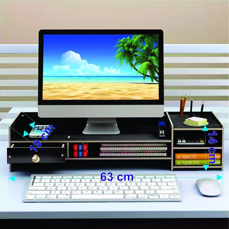 Kệ máy tính kệ sách kệ hồ sơ để bàn kèm cắm viết bằng gỗ KMT1Kệ máy tính kệ sách kệ hồ sơ để bàn kèm cắm viết bằng gỗ 2 mẫu MỚI Kiểu dáng hiện đại, thời trang, chất liệu tự nhiên, thiết kế tháo lắp thông minh, là món quà hấp dẫn cho người thân hay để trang trí cho bàn học/làm việc của gia đình! Dùng để máy vi tính, hồ sơ, sách vở, bút, đồ dùng văn phòng.., đặt trên bàn làm việc. Kệ được thiết kế thông minh nhằm làm giảm hiệu ứng đau lưng mỏi cổ cho dân văn phòng, sinh viên, học sinh.. khi phải làm việc với máy vi tính thường xuyên và liên tục . Chất liệu : Gỗ tự nhiên sấy khô Màu vân gỗ óc chó y hình Kích thước : KMT1(62.5x13.5x18.5). Xem kích thước cụ thể trên hình ảnh Trọng lượng : 3kg Gọn nhẹ dễ dàng tháo lắp mang theo. Lắp ráp theo hướng dẫn, có tua vít kèm sản phẩm. Đóng gói : Hộp Carton