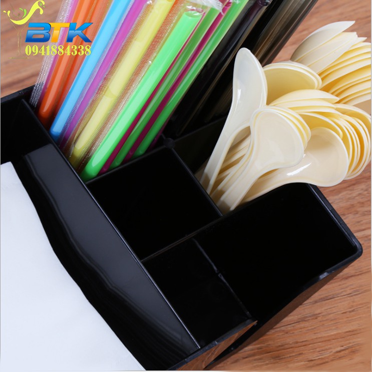 Hộp đựng ống hút khăn giấy muỗng tiện lợiVới thiết kế nhựa cao cấp bền đẹp, sản phẩm được sử dụng nhiều trong các nhà hàng, quán cà phê... Tiết kiệm diện tích nhiều cho mặt quầy bar, lịch sự và sang trọng.