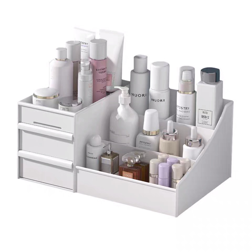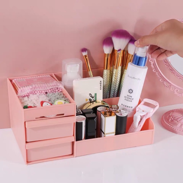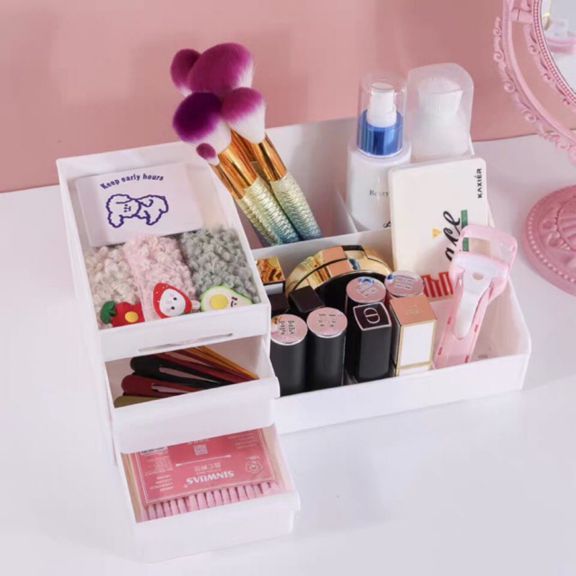 Tên sản phẩm: Kệ đựng mỹ phẩm hộp đựng đồ trang điểm hai tầng nhiều ô Hàn QuốcKệ để đồ mỹ phẩm đa năng được làm bằng chất liệu nhựa an toàn, được thiết kế hợp lý với 3 tầng, 2 ngăn . Hộp kích thước lớn, có thêm ngăn kéo, để được nhiều đồ tiện dụng.
