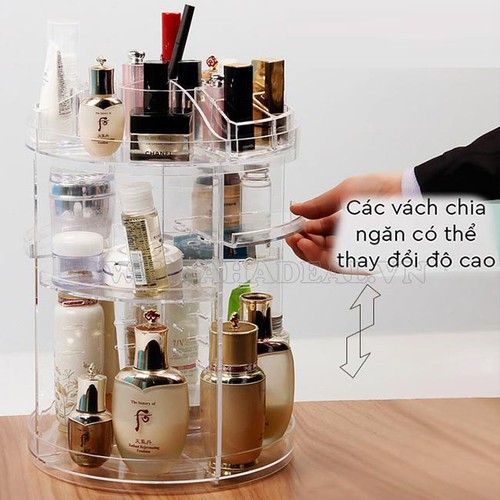 Kệ Đựng Mỹ Phẩm Xoay Tròn 360 Độ Tiện Dụng có nhiều ngăn đựng chuyên dụng có kích thước khác nhau giúp bạn có thể đựng và bảo quản lên tới cả trăm loại đồ trang điểm cá nhân vô cùng tiện lợi như: kem dưỡng, kem nền, nước hoa hồng, xịt khoáng, cọ trang điểm, son,……. Tất cả đều có thể được xếp gọn trong 1 chiếc khay mỹ phẩm nhờ đó tiết kiệm phần lớn thời gian cho bạn mỗi khi phải ngồi xếp đồ cũng như tiết kiệm không gian bàn trang điểm cho bạn. Bạn chỉ việc xoay 1 vòng, lần lượt những mỹ phẩm bạn cần tới sẽ có mặt ngay ở trước mặt bạn.