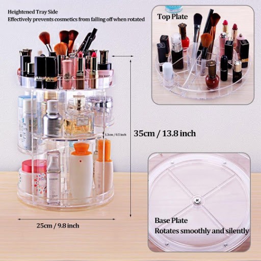 Kệ để mỹ phẩm có trục xoay 360 độ có thiết kế hình trụ tròn. Tủ có rất nhiều ô, ngăn nhỏ, nhiều tầng…rất tiện lợi để các chị em sắp xếp, phân loại mỹ phẩm, dụng cụ trang điểm hay trang sức. Kệ có kích thước lớn với chiều cao 35 cm, đường kính 25 cm nên có thể chứa được cả những lọ mỹ phẩm size lớn, hoàn toàn không cần lo lắng vấn đề rơi vỡ. Sản phẩm sẽ là món đồ gia dụng thông minh giúp góc trang điểm trở nên gọn gàng, sang trọng hơn.
