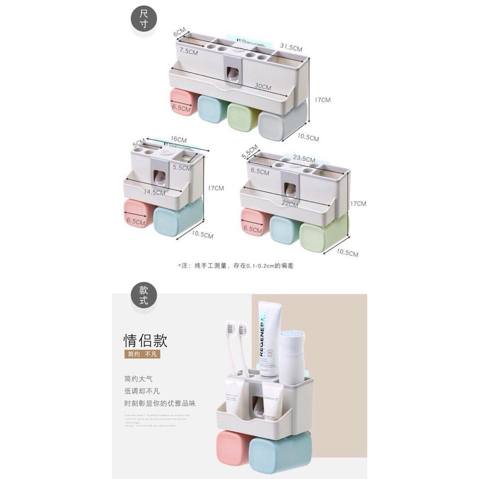 Bộ sản phẩm có : 1 kệ nhả kem + 2 cốc vuông + 1 miếng dán tường cường lực chắc chắn