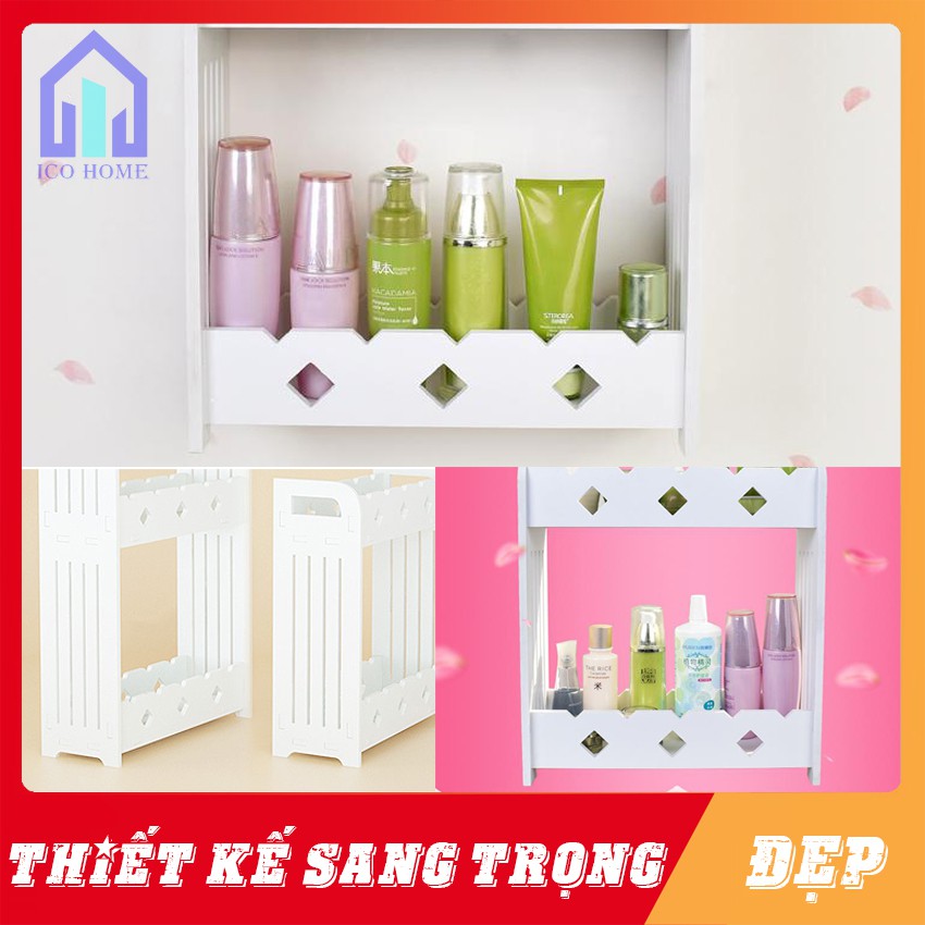 Kệ nhà tắm của Ico Home thiết kế nhỏ gọn, tinh tế nhưng vẫn chứa được rất nhiều vật dụng như kem đánh răng, bàn chải, dầu gội, nước hoa, mỹ phẩm chăm sóc da, tóc...