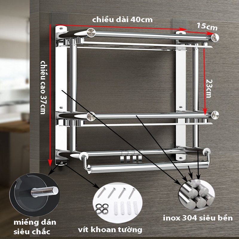 - Bộ gồm Giá inox + bộ dính tường + bộ vít nở đi kèm