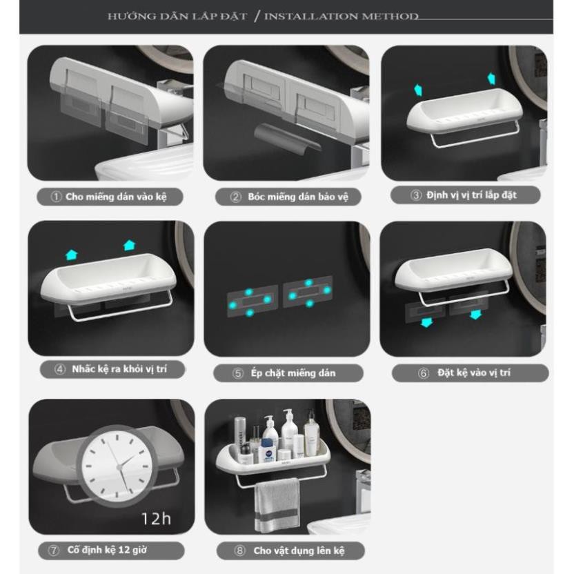Gắn kệ vào vị trí cố định và cho các vật dụng vào (Đảm bảo 12 giờ sau khi miếng dán dính vào tường).