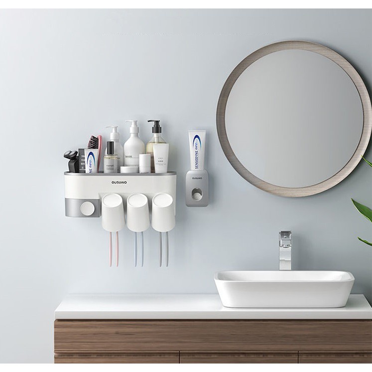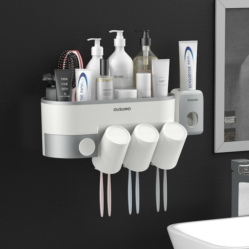 Nhà Cửa & Đời Sống > Đồ dùng phòng tắm > Phụ kiện nhà tắm, nhà vệ sinh || Kệ Nhà Tắm Thông Minh OUSUWO Dán Tường Kèm Cốc Cao Cấp, Giá treo bàn chải đánh răng + hộp nhả kem đánh răng tự động - OUCòn hàng