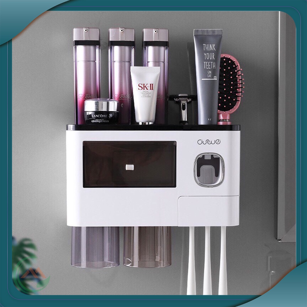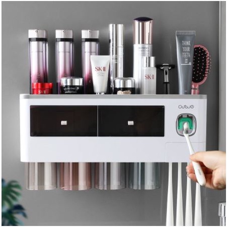 Bộ kệ nhà tắm tiện dụng dán tường đựng cốc bàn chải kết hợp nhả kem tự động tiện lợi, thông mình loại 2,3,4 cốc