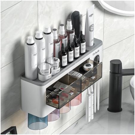 Bộ kệ nhà tắm tiện dụng dán tường đựng cốc bàn chải kết hợp nhả kem tự động tiện lợi, thông mình loại 2,3,4 cốcMô tả sản phẩm: