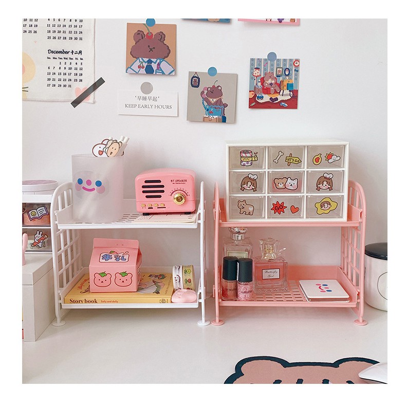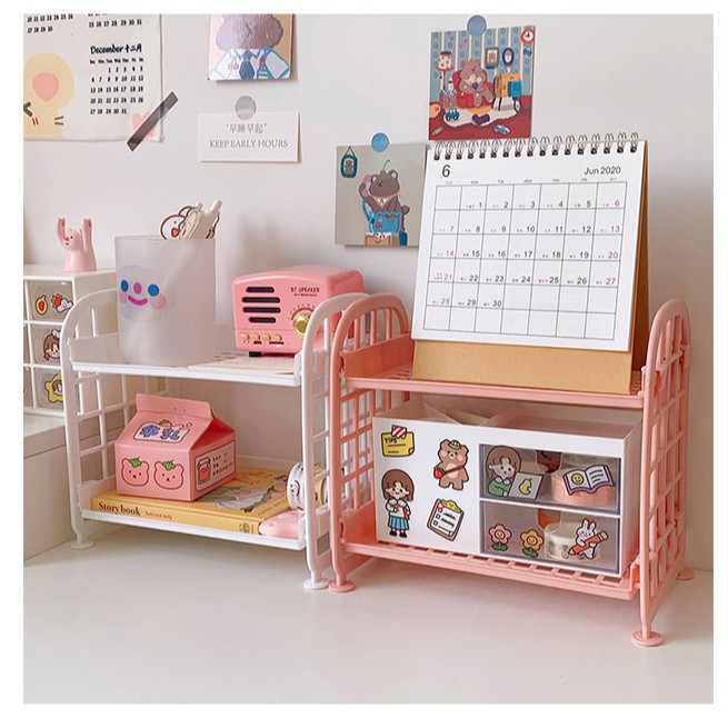 Kệ nhựa mini 2 tầng để đồ dùng học tập trang trí bàn học phong cách Hàn Quốc dành cho cô gái dễ thương ins