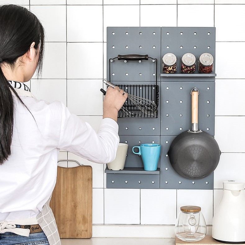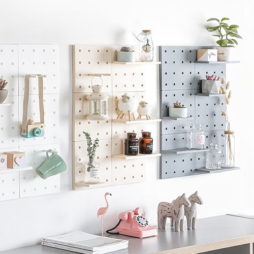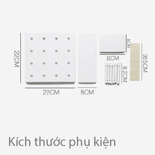 🍀 Sản phẩm bao gồm: 1 tấm nhựa đục lỗ gắn tường, 2 kệ treo, 6 thanh gắn và 4 miếng keo dán