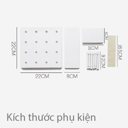 - Sản phẩm bao gồm: 1 tấm nhựa đục lỗ gắn tường, 2 kệ treo, 6 thanh gắn và 4 miếng keo dán