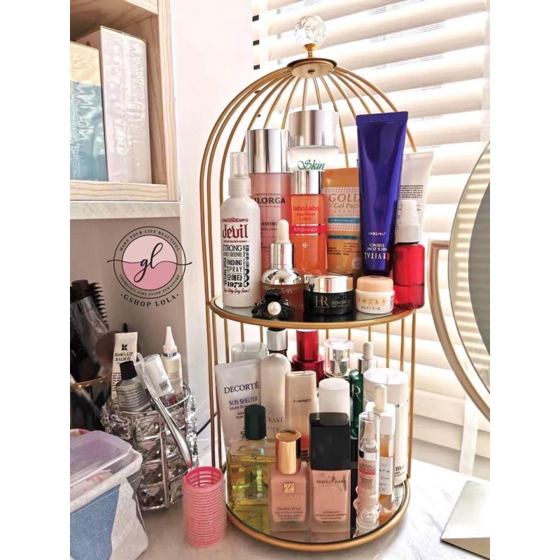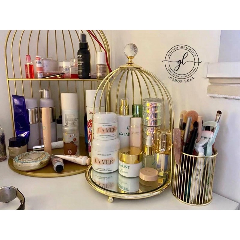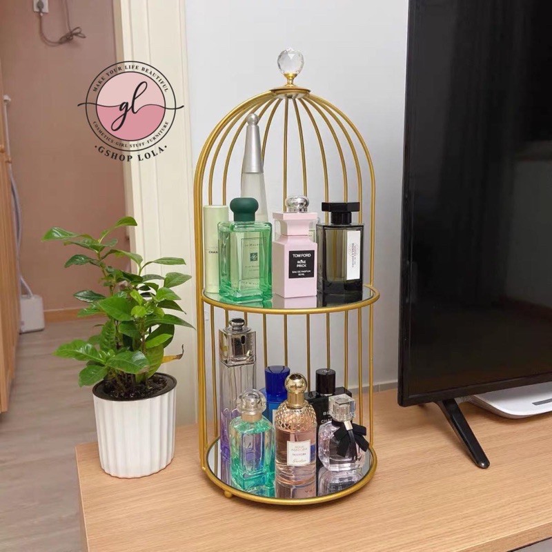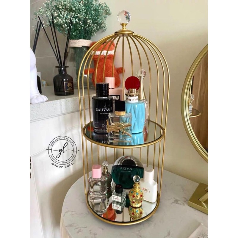Nhà cửa & Đời sống > Nội thất > Kệ & Giá || Kệ nước hoa, mỹ phẩm, skincare hình lồng chim cao cấp đế gương sang chảnh, khung gold cứng cápCòn hàng