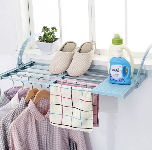 Kệ Phơi Ban Công Co Giãn thông minh tiết kiệm không gian bạn co thể gắn lên cửa sổ giup bạn phơi đồ, phơi khăn , phơi giày hoặc để các vật dụng cần thiết.Kích thướt: 50*35cm