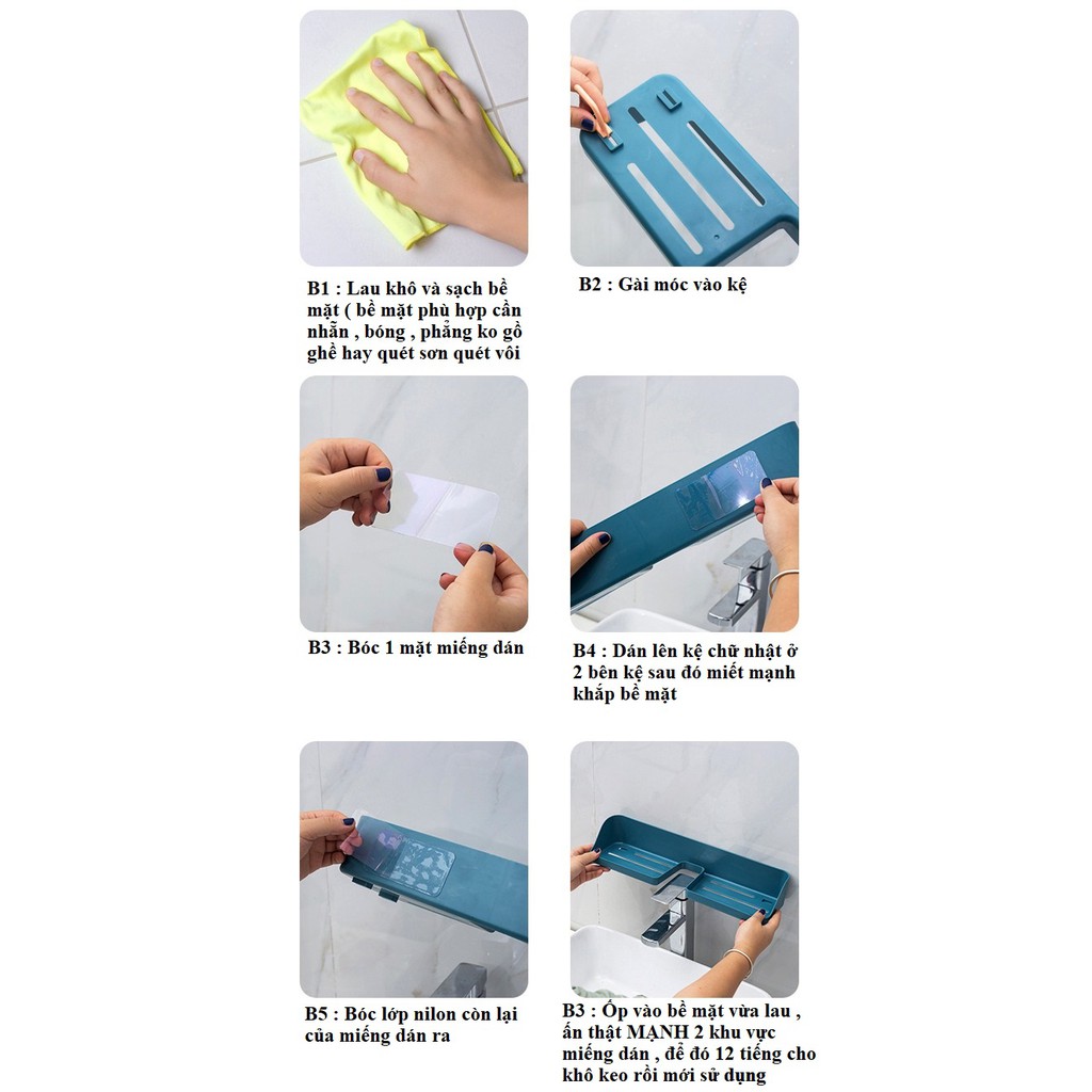 SAU KHI DÁN miếng dán vào kệ rồi thì ấn MẠNH kệ vào tường . Ấn thêm nhiều lần tại khu vực miếng dán rồi để đó tầm 12 - 24 tiếng mới treo giá kệ lên ( Độ chắc sẽ đạt mức cao nhất )