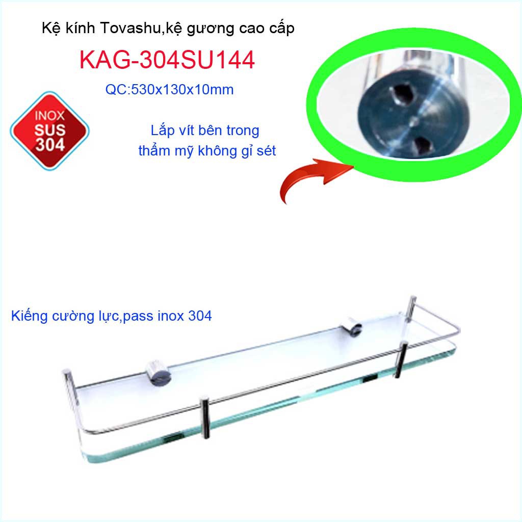 Kệ phòng Tovashu KAG-304SU144, kệ kính cường lực Inox SUS304 Nhật Bản cao cấp siêu bềnKích thước dài 530mmx cao rộng 130mm x cao 50 mm