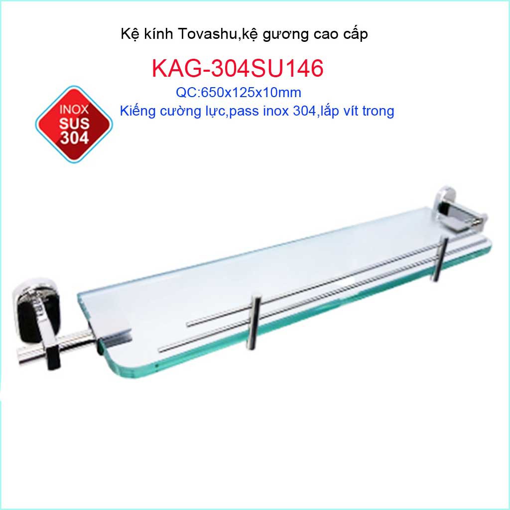 Chất liệu: Kệ kính nhà tắm, kệ kiếng, kệ gương Tovashu KAG-304SU146 sản xuất bởi chất liệu inox SUS304 cao cấp Nhật Bản, Phần kính cường lực theo tiêu chuẩn VN, Inox sáng bóng theo thời gian,độ bóng bề mặt cao, hạn chế bám bẩn trở lại