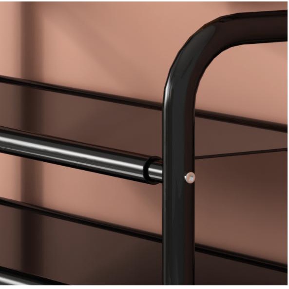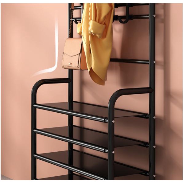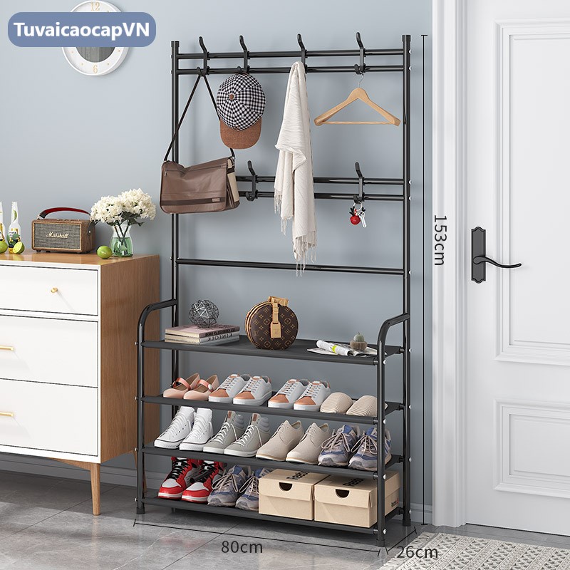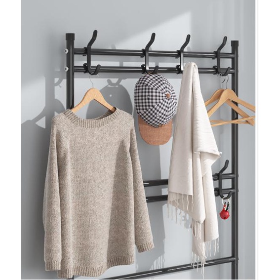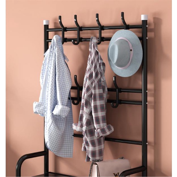 Gía treo quần áo thiết kế thêm 1 tầng có các thanh sắt ngang để đồ, ngoài việc treo quần áo còn có thể để được rất nhiều vật dụng lên tầng dưới của kệ áo như : Giày dép, túi sách, ba lô...