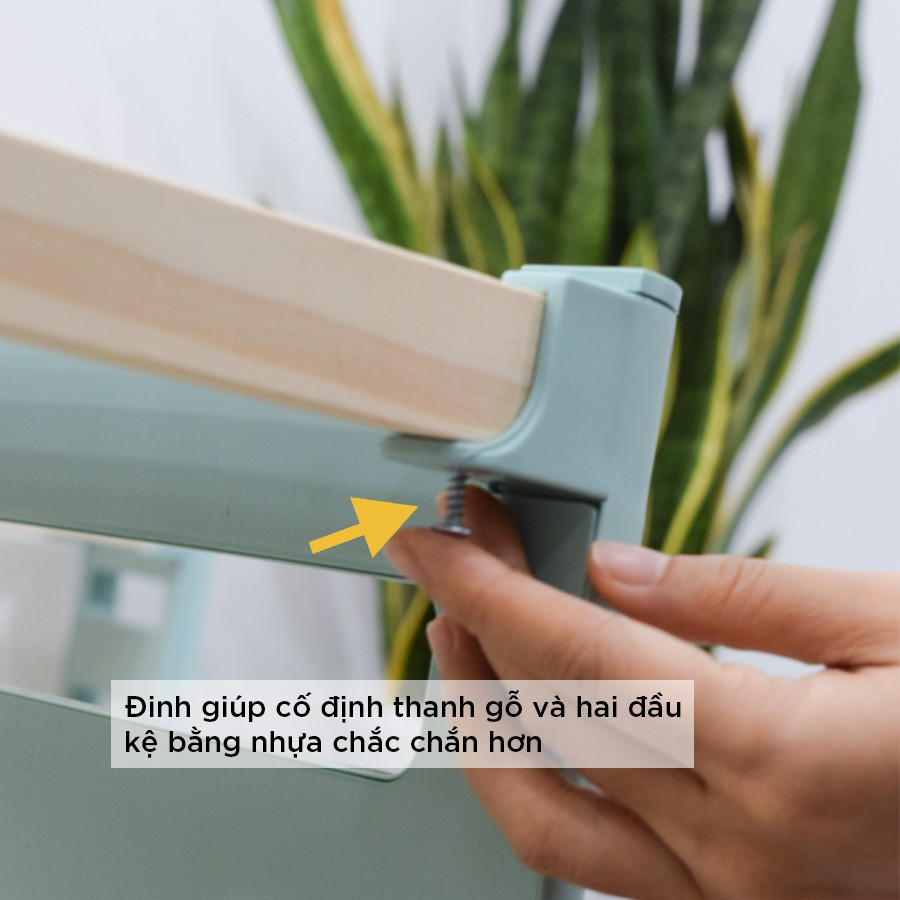 Hai đầu kệ gỗ được gắn kết bằng 2 thanh nhựa cứng.