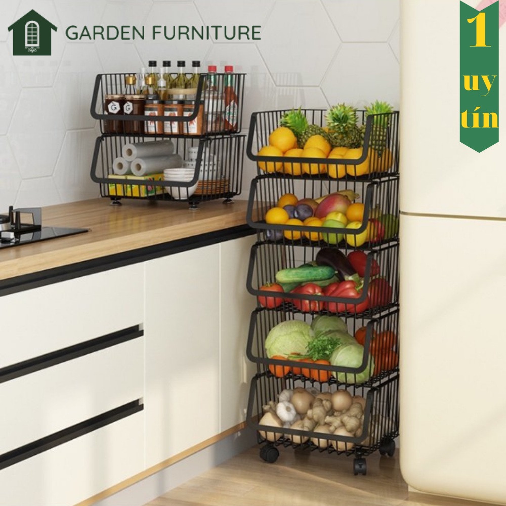 Kệ sắt 5 tầng đa năng, tháo rời có nắp đậy tiện dụng, giá kệ nhà bếp phòng khách cóbánh xe di chuyển dễ dàng đựng rau cũ