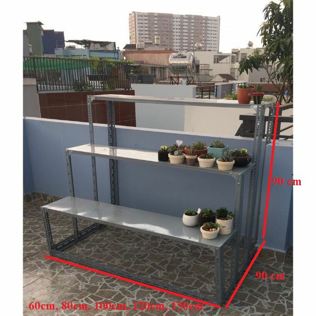 Kệ sắt bậc thang 3 tầng cho mọi công việc . Kích thước dài 0,6m, 0,8m, 1m, 1,2m và 1,5m
