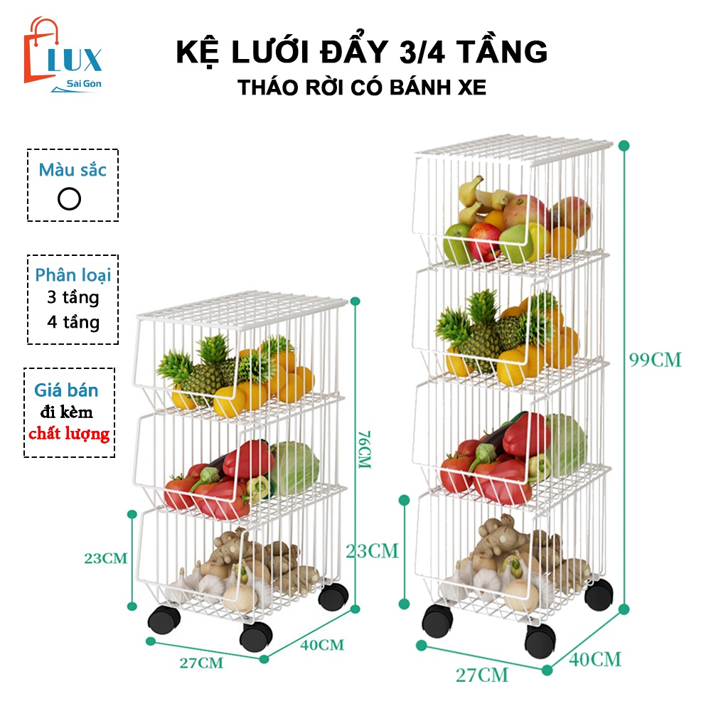 Kệ sắt đa năng 3/4 tầng tháo rời có nắp đậy tiện dụng, giá kệ nhà bếp có bánh xe di chuyển dễ dàng