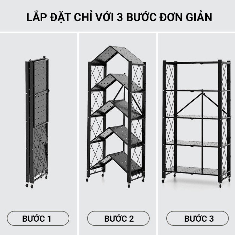 Kệ có khả năng gập nhỏ tiết kiệm không gian sống trong gia đình khi chưa sử dụng đến, các thanh ngang có thể gập lại làm đôi và khi sử dụng dụng sẽ được cố định bằng 3 thanh đỡ giúp kệ cố định và hoàn toàn chắc chắn.