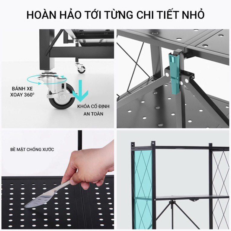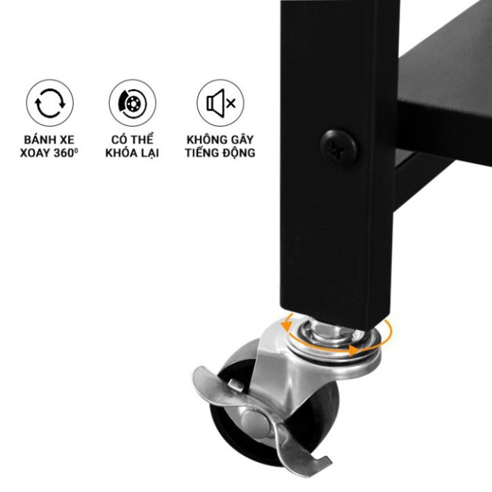 Với bề mặt chống xước cực tốt từ lớp sơn đen tĩnh điện làm tăng thêm tính thẩm mỹ. Bên cạnh đó, kệ đa năng còn có bánh xe có thể xoay vòng 360 độ giúp dễ dàng di chuyển mà không phải dùng sức, tiết kiệm thời gian. Đặc biệt riêng bánh xe có khóa cố định an toàn, giúp kệ ổn định, không bị xê dịch gây nguy hiểm trong quá trình sử dụng.
