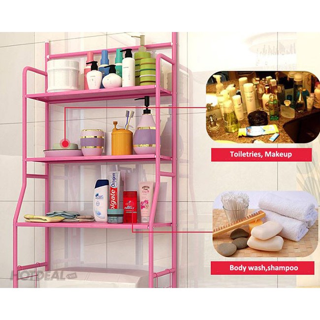 - Kệ gồm có 03 tầng, thích hợp đựng hóa mỹ phẩm nhà tắm như dầu gội, sữa tắm, kem đánh răng… Có móc treo giấy vệ sinh, khăn lau tay,…
