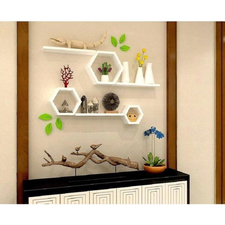 Quy cách sản phẩmBộ bao gồm 6 kệ gỗ treo tường 3 lục giác 3 thanh ngang màu trắng