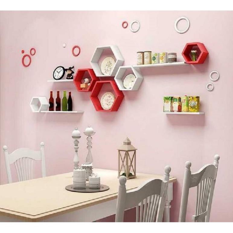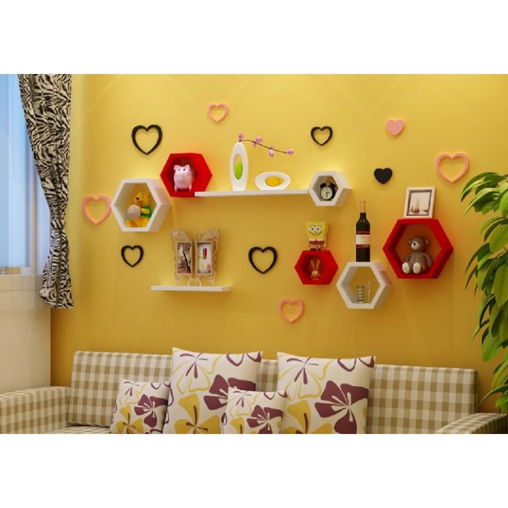 Quy cách sản phẩmBộ bao gồm kệ gỗ treo tường 6 lục giác 4 thanh ngang đỏ trắng