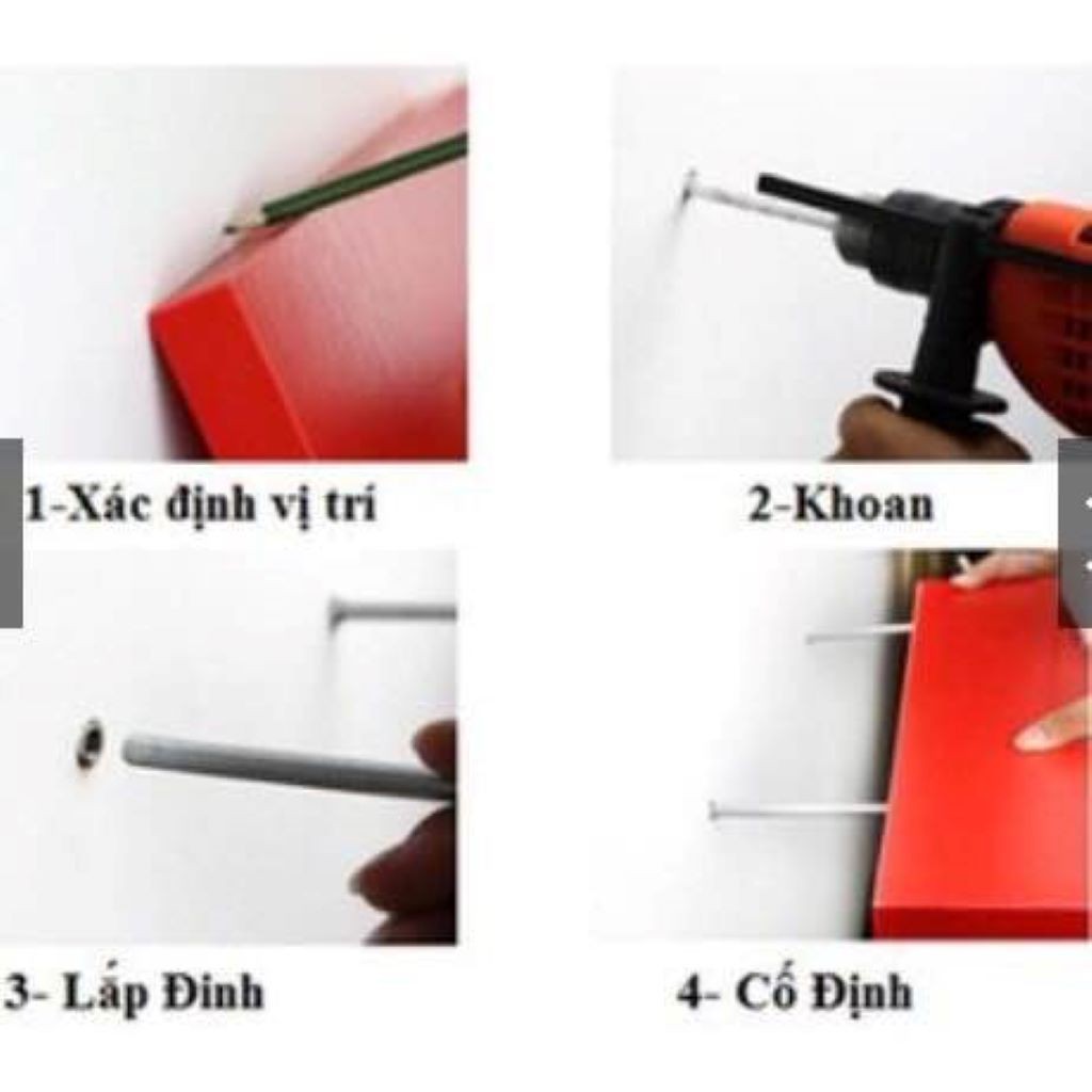 Bước 1: ướm kệ lên vị trí muốn lắp đặt --> đánh dấu vị trí lỗ khoan (bằng cách xỏ thanh ren vào lỗ khoan sẵn) rồi đánh dấu vị trí cần khoan.
