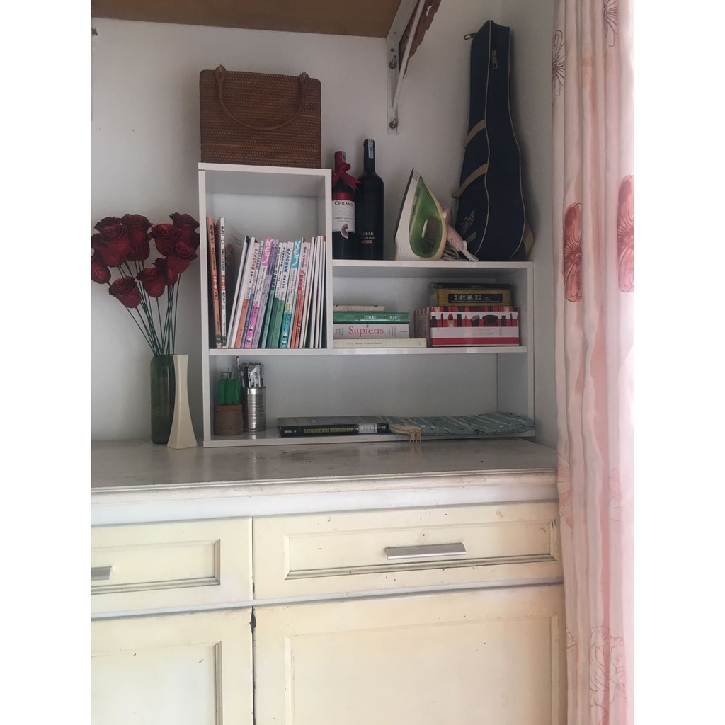 Kệ có 3 tầng và 3 ngăn rộng rải để được nhiều sách vở, và đồ trang trí lưu niệm, vật dụng cá nhân, sản phẩm…