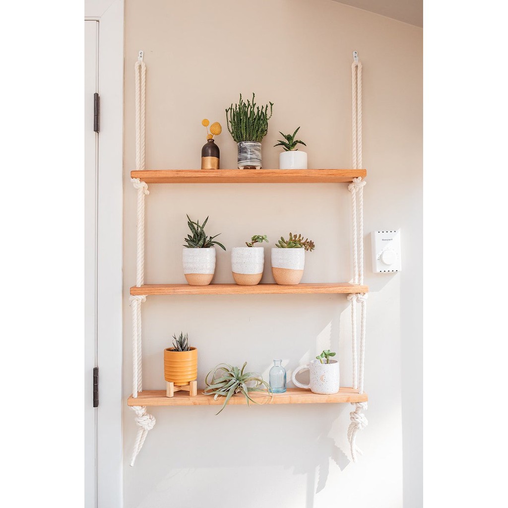 Sản phẩm là một lựa chọn tuyệt vời để tạo nét phá cách trong không gian nhà bạn. Kệ gỗ treo tường bằng dây thừng vừa là một món đồ decor xinh xắn, để cây cảnh và giúp bạn sắp xếp đồ đạc gọn gàng, tiết kiệm diện tích hơn.
