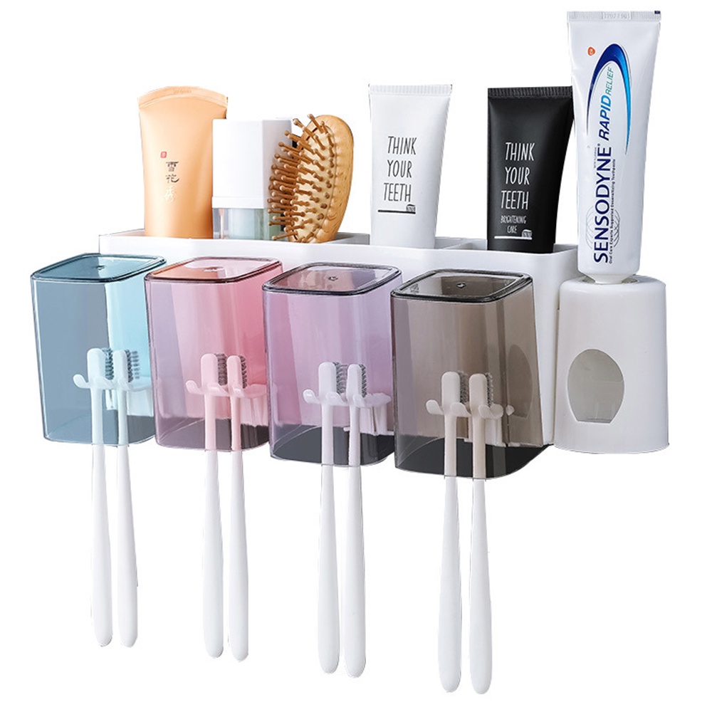 Sản phẩm bao gồm 4 ngăn đựng các vật dụng thiết yếu như: lược, dao cạo râu, kem dưỡng,…, 4 cốc với 4 màu khác nhau, 8 khe để treo bàn chải đánh răng, 1 khay lấy kem đánh răng tự động.