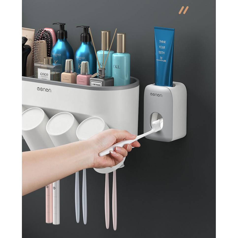 - Bộ sản phẩm gồm 1 Kệ để đồ OENOn + Cốc + Hộp Nhả Kem + Bộ Dán Tường