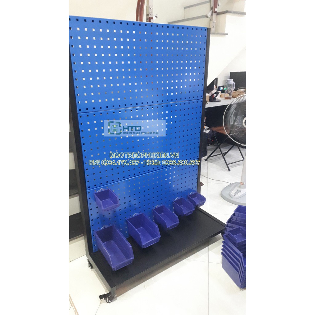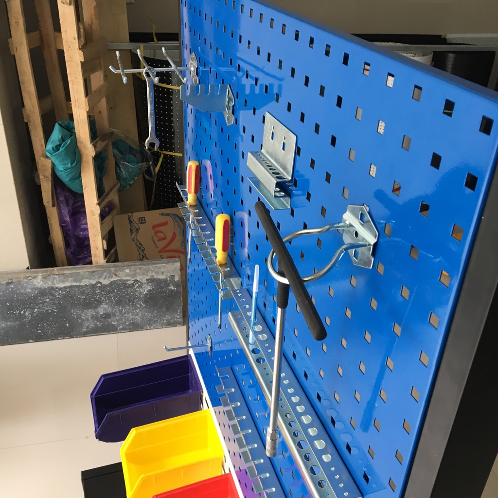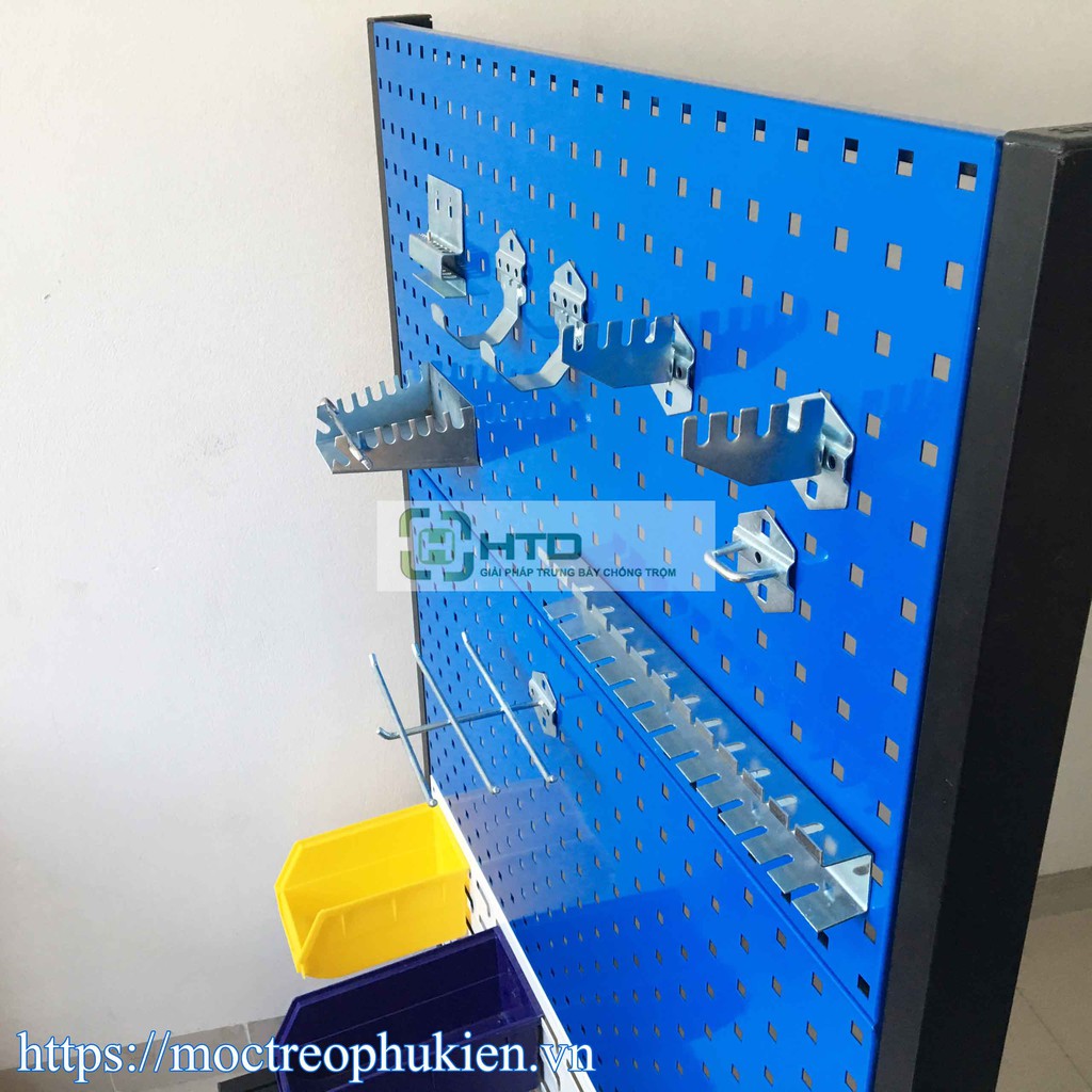Phần trên cùng của bộ kệ được thiết kế 2 bảng lỗ đứng, bạn cũng có thể lắp đặt thêm các móc treo dụng cụ đi kèm.