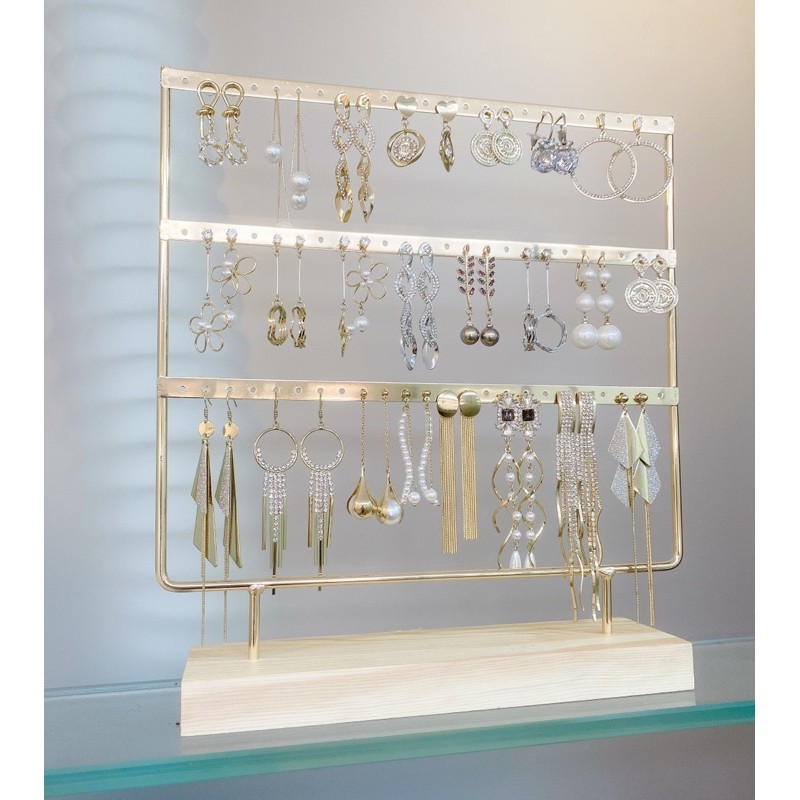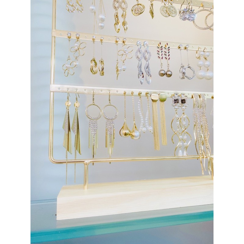 Kệ treo hoa tai sang trọng cho shop bán phụ kiện , hoặc dành cho các bạn nữ treo hoa tai gọn gàng- Kệ đế bằng gỗ thông , phần thân mạ màu vàng sáng , bóng đẹp , không bong tróc rỉ sét