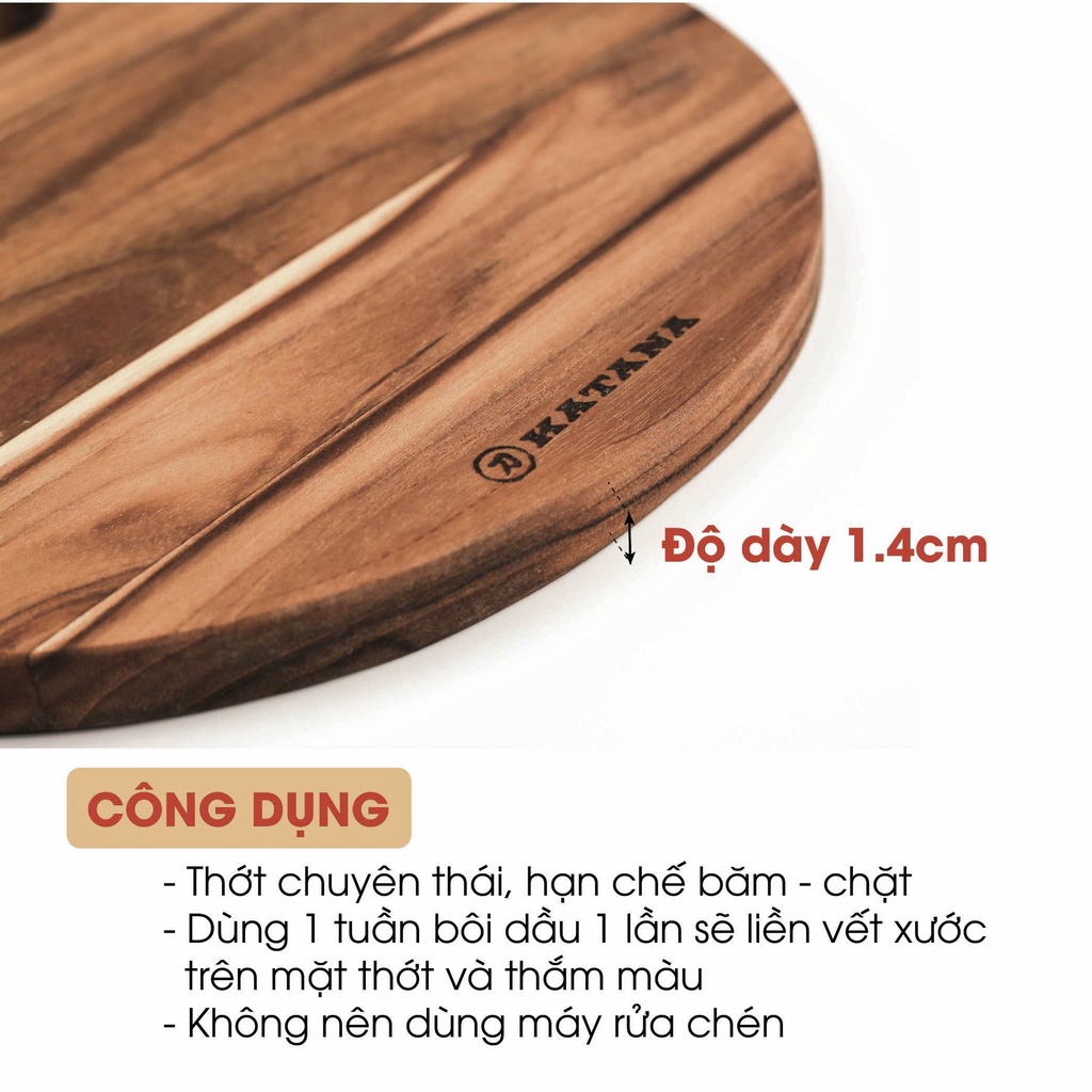 Thớt Gỗ Teak Cao Cấp KATANA - Hình Tròn - Có Tay Cầm và Lỗ Treo - Hàng Chính Hãng BH 12 Tháng 1 Đổi 1 Trong 7 Ngày