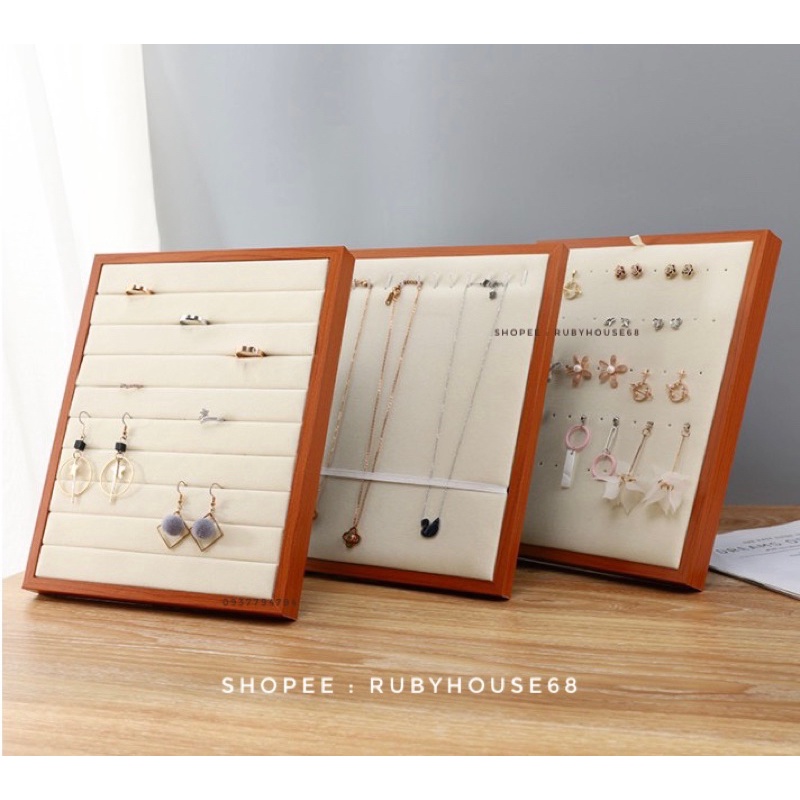 Kệ treo trang sức sang trọng cho shop- Kệ có 3 mẫu , chất liệu khung gỗ ép dán viền cùng màu , bên trong phối vải nhung mịn màu be