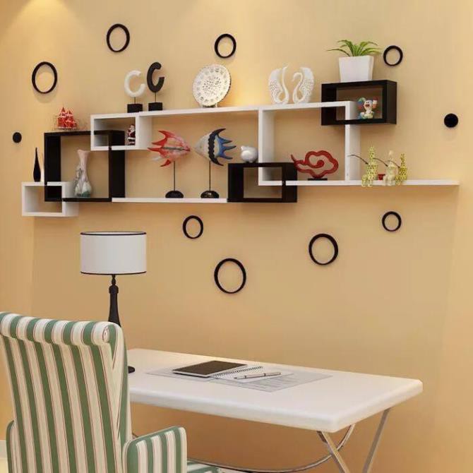 Bộ kệ treo tường chữ nhật ô vuông và thanh ngang tạo điểm nhấn cho góc tường trở nên xinh động và hấp dẫn hơn bao giờ hết.