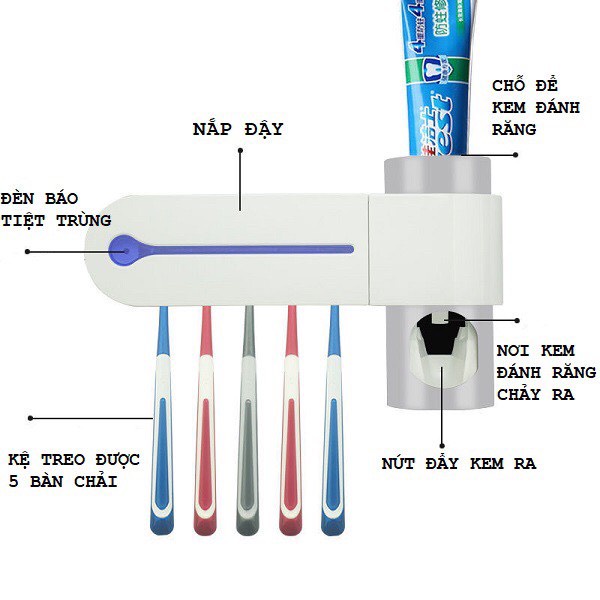 * Công Dụng: Vừa Treo Bàn Chảy Răng và Kem Đánh Răng Vừa Hỗ Trợ Tiệt Trùng Vi Khuẩn Trên Bản Chải. Ngoài ra sản phẩm còn có thể hỗ trợ tiệt trùng Dao Cạo Râu, Bàn Chải Điện,