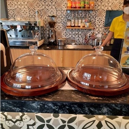 Kệ trưng bày bánh kẹo, trái cây thiết kế sang trọng, hiện đại - nắp chụp nhựa trong suốt, chân gỗ
