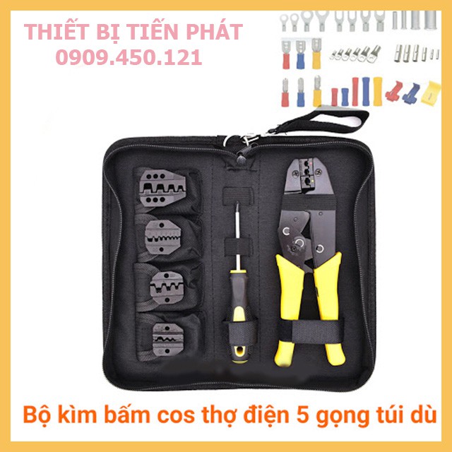 Bộ Kềm, Bộ Kìm 5 IN 1 Với 5 Đầu Bấm COS Đa Năng Bằng Thép - Niken Crom Cao Cấp (Tặng Kèm Tua Vít + Túi Đựng Vải Dù)Kìm bấm cos chuyên dụng cho thợ điện, kềm bóp đầu cốt dây điện. Sử dụng trong thi công lắp đặt tủ bảng điện, tủ điều khiển, hộp điện trong xe hơi hoặc công nghiệp.