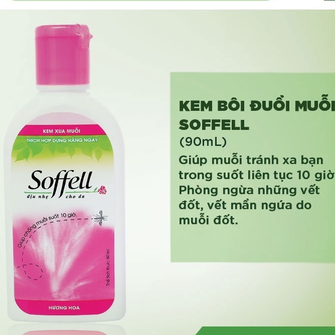 1, Mô Tả Sản Phẩm Kem Chống Muỗi Soffell Hương HoaKem xua muỗi hương hoa Soffell vẫn giữ cho làn da mềm mại, lưu hương hoa dịu dàng dễ chịu nhưng giúp muỗi tránh xa bạn trong suốt liên tục 10 giờ. Bên cạnh đó, kem chống muỗi Soffell giúp bạn phòng ngừa những vết đốt, vết mẩn ngứa, các căn bệnh nguy hiểm do muỗi gây ra.