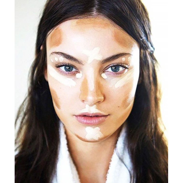 - Đế tạo những điếm nhấn trên gương mặt như sống mũi, vùng xương hàm, dùng đầu ngón tay thoa một lượng kem màu tối mỏng vừa đủ để giúp khuôn mặt thon gọn và hài hoà.