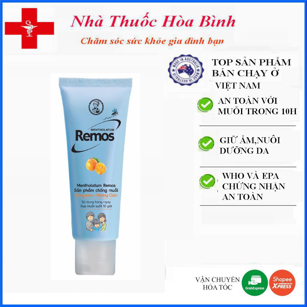 - Mentholatum Remos - Dạng kem, tuýp 70g- Hương Cam- Sản phẩm chống muỗi độc đáo, chứa Diethyltoluamide 15% đã được WHO và EPA chứng nhận hiệu quả và tính an toàn trong việc xua muỗi. Mentholatum Remos đạt hiệu quả xua muỗi suốt 10 giờ. Mentholatum Remos còn có Aloe Vera và Vitamin E giúp giữ ẩm và nuôi dưỡng da.