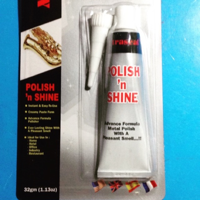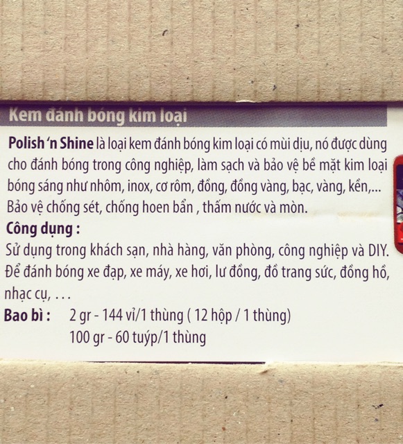 Sản phẩm dạng kem dùng để làm bóng kim loại như đồng , thau , nhôm , thép , vàng , bạc , dễ sử dụng và bảo quản dùng tiện ích cho việc làm đẹp các loại đồ thông dụng.Vỉ 32gr , hộp 100gr.