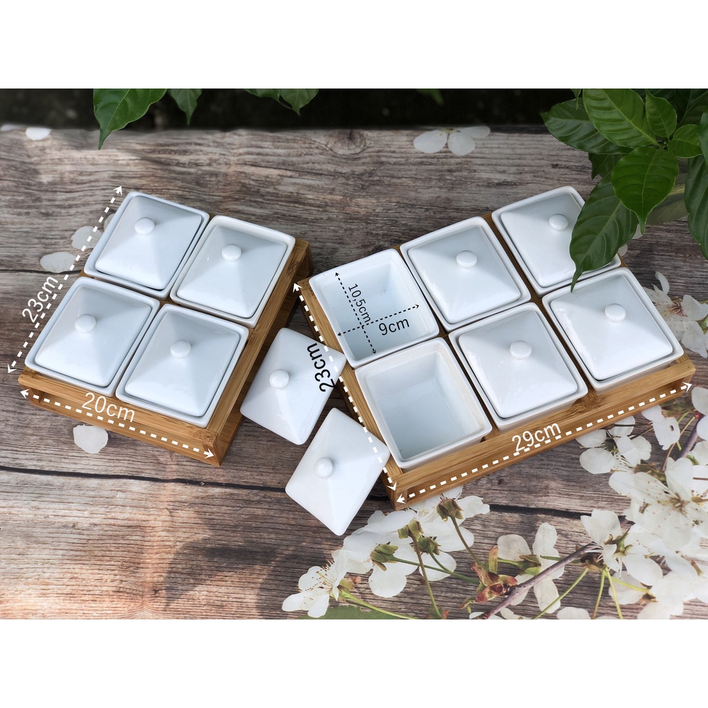 Sản phẩm bao gồm khay gỗ và bát đựng bánh kẹo