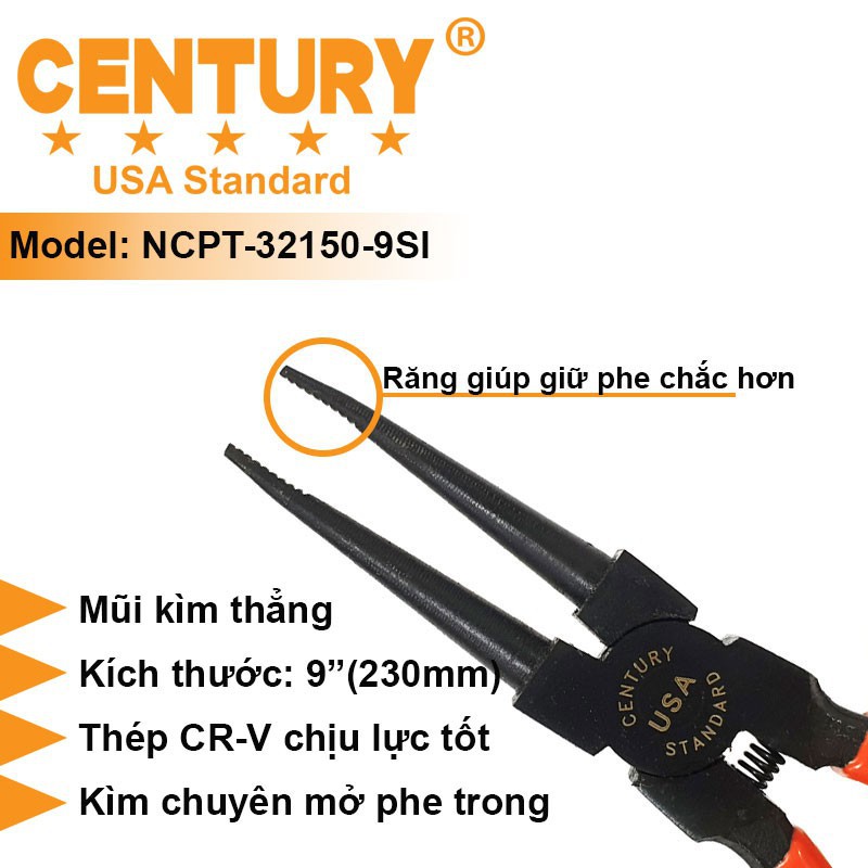Kềm Mở Phe, Kìm Mở Phe 9" (230mm) Vô Thẳng, Vô Cong, Ra Thẳng, Ra Cong CENTURY Mã NCPT-32150-9SI Với Thép Tốt.