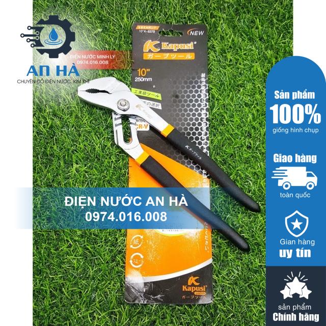 Kìm mỏ quạ Kapusi 10inch 250mm có độ mở tối đa là 50mm với 5 lỗ chỉnh khẩu độ khác nhau. Là dụng cụ quen thuộc dùng để sửa chữa nước cho gia đình bạn.